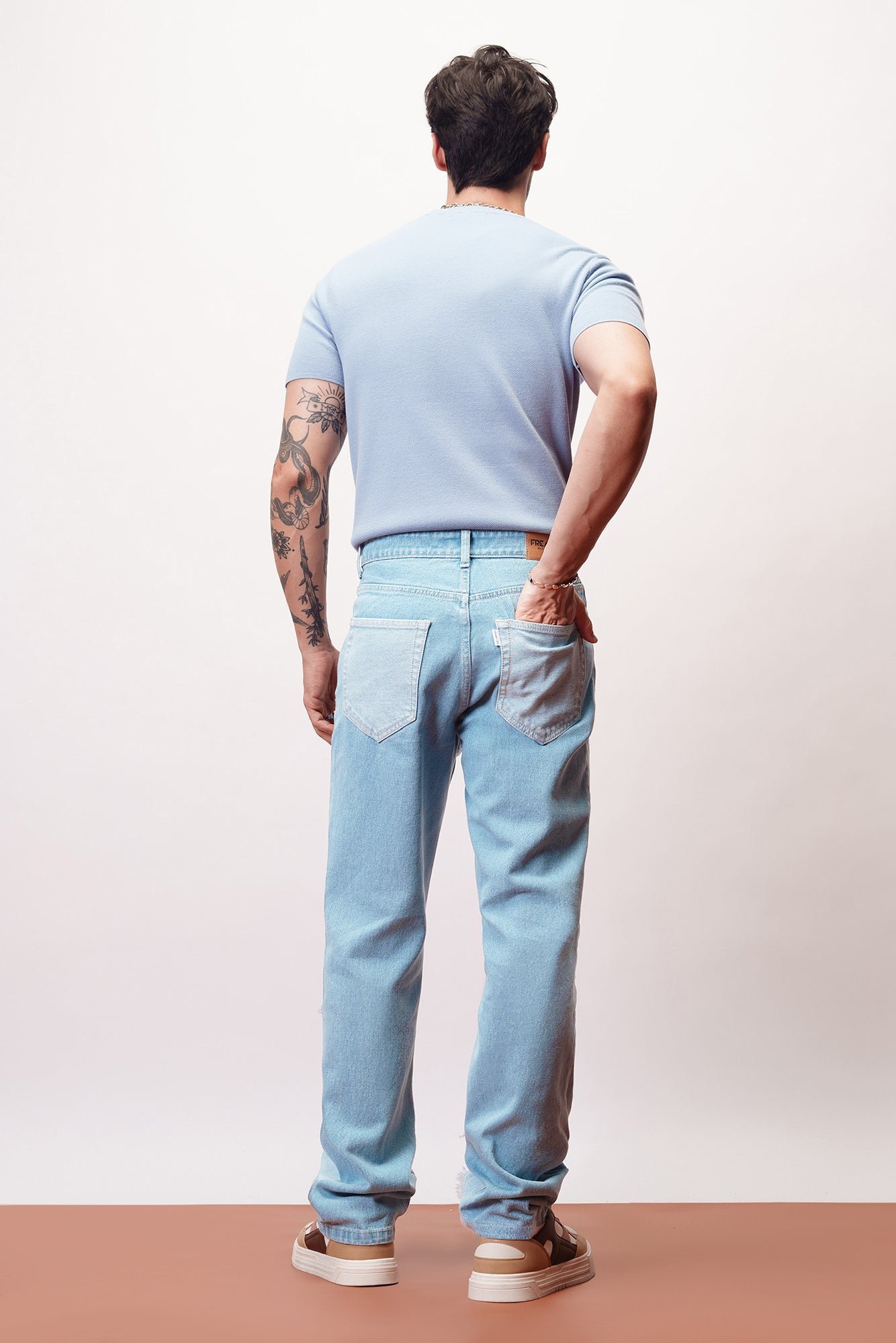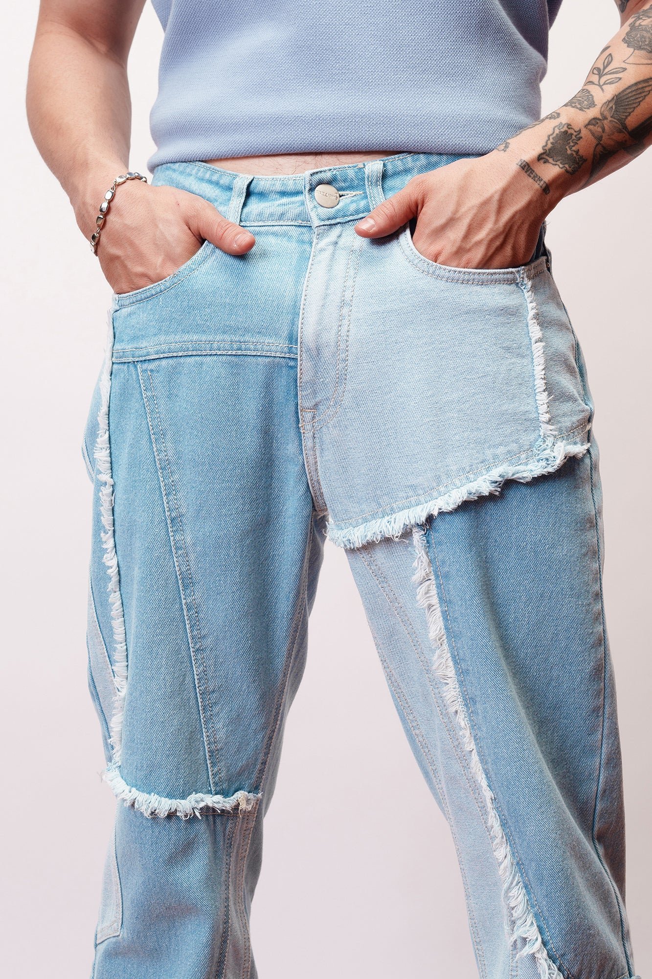 The Rayaa® X Rebel Jeans are a bold fusion of artistry and streetwear flair, designed for the fearless Indian trendsetter. Crafted from premium lightweight denim, these jeans showcase a unique patchwork design with a light blue wash, featuring raw, frayed edges and asymmetrical panels that create a one-of-a-kind look. The relaxed fit offers ultimate comfort while catering to diverse Indian silhouettes, making them ideal for casual outings or bold fashion statements.