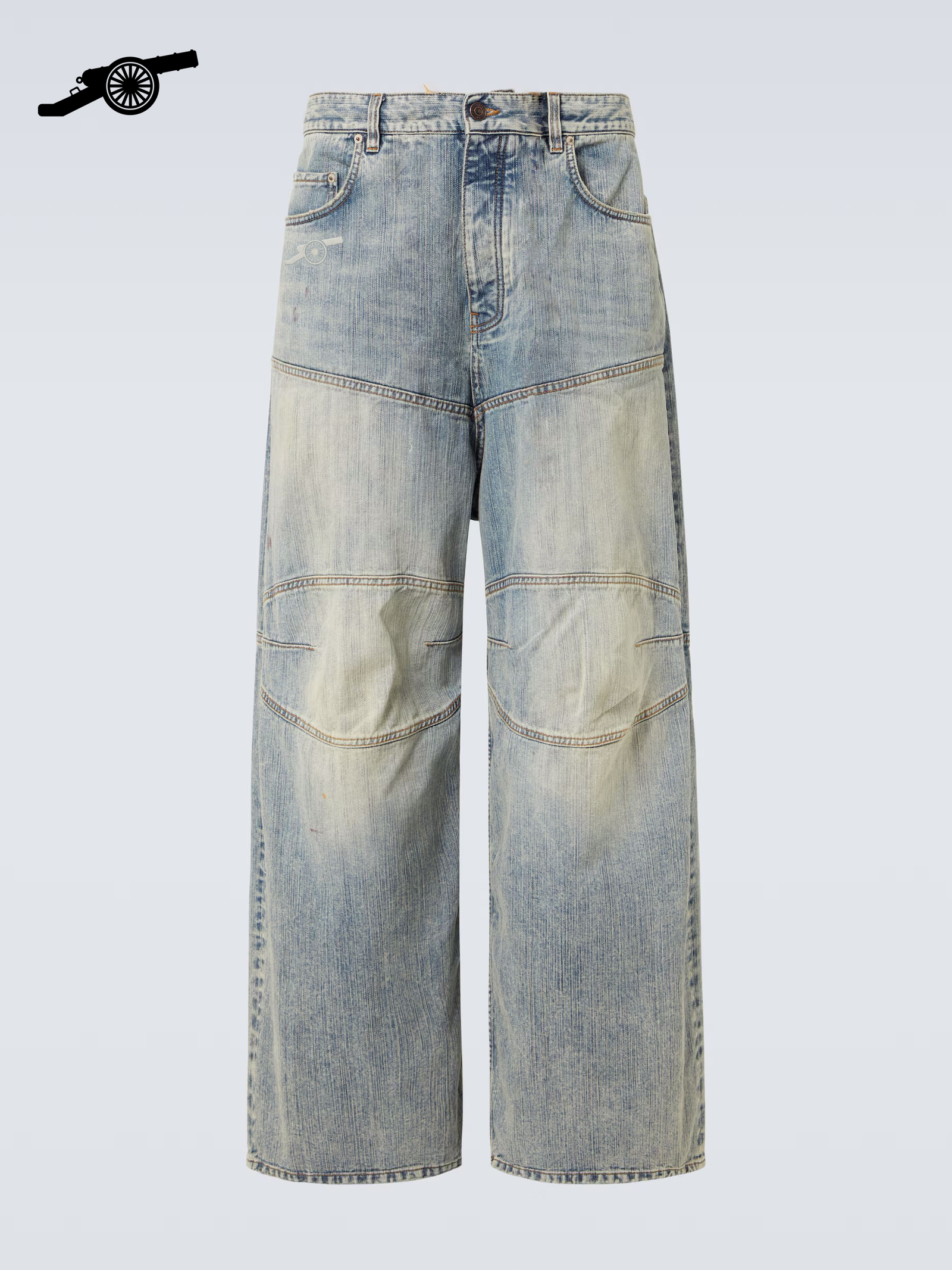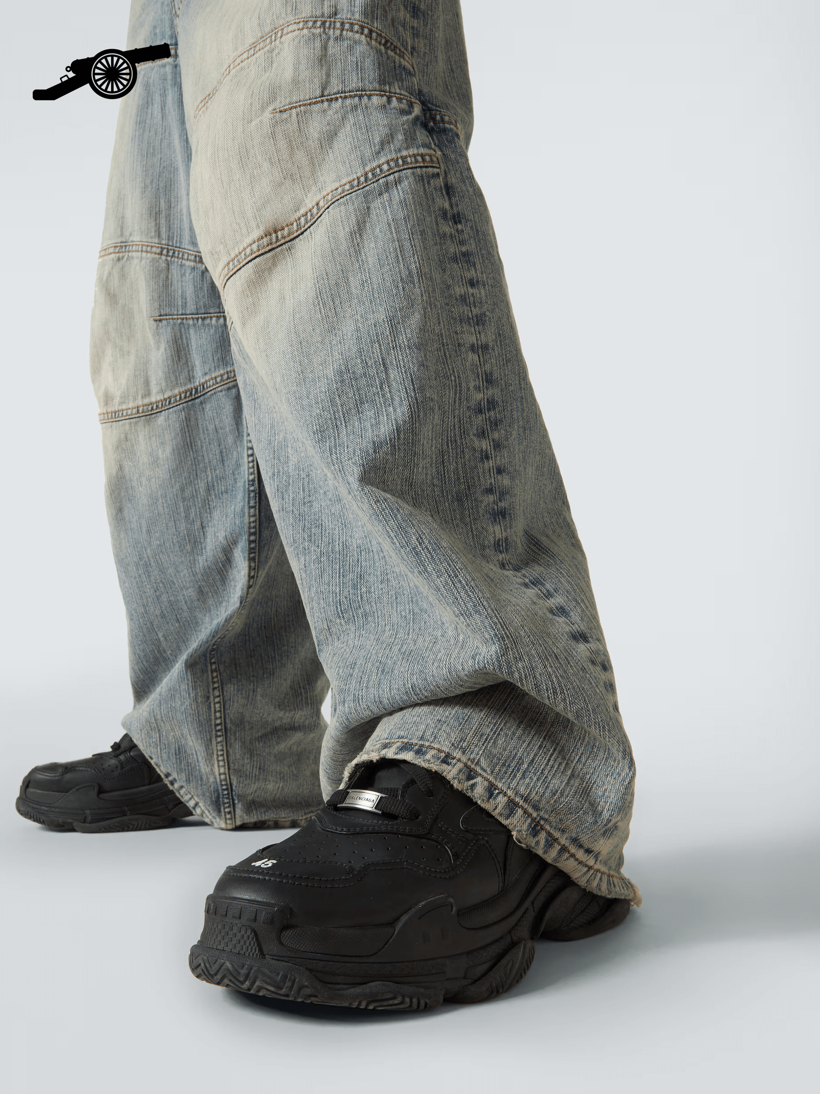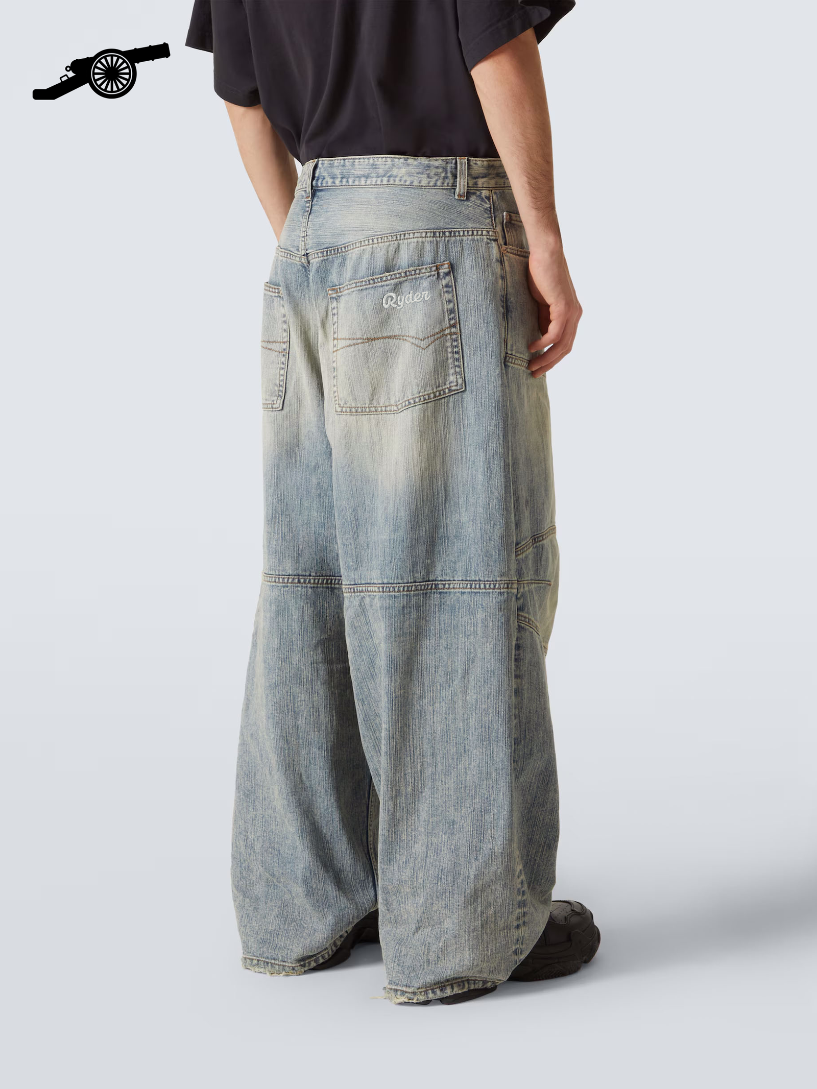 RYDER’s widest silhouette yet. Crafted from 14.5 oz 100% Organic Cotton denim with articulated knee panels and a soft, icy fade. Titan moves slow, wide, and with serious gravitational pull.